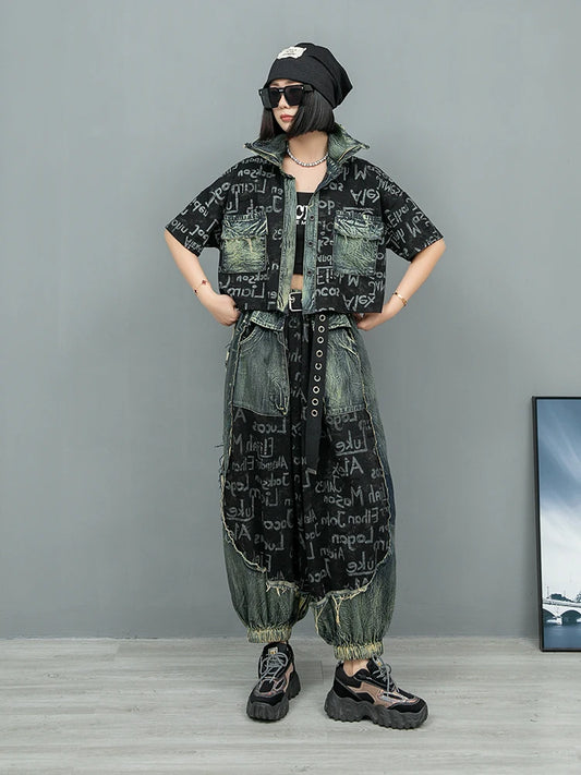 Letter Printed Denim Jacket + Lantern Pants 2 piece set