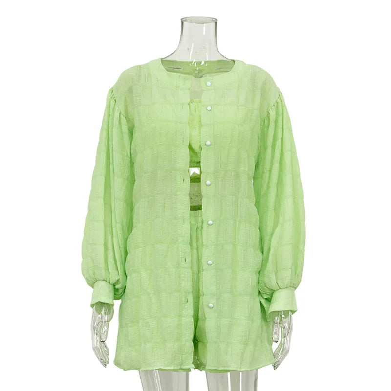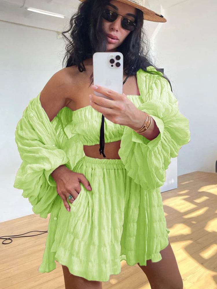 2023 Summer Autumn Women Holiday Shorts Set Long Sleeve Solid White 2 Two Piece Matching Sets For Women