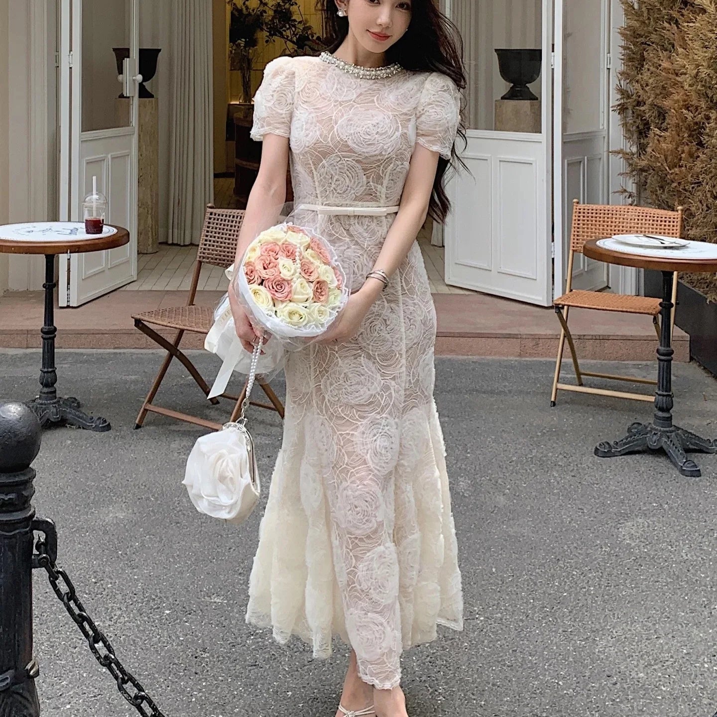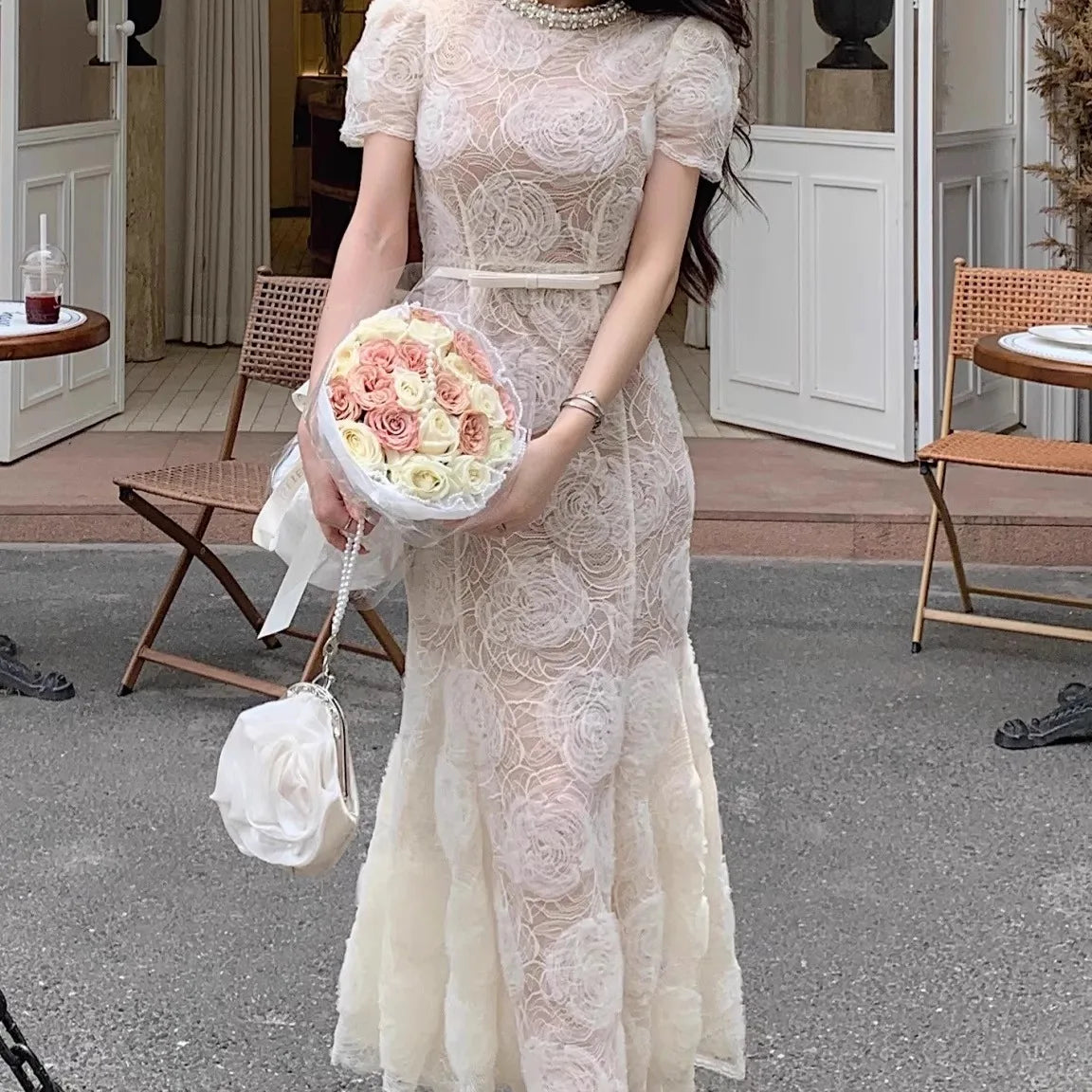 Ele Long Lace Dr Women's Slimming Waist Design Heavy Beading 2025 New Sle Faionable Spring Summer Autumn Dr