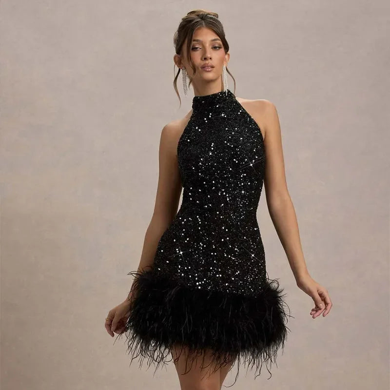 Elegant Feather Patchwork Sequin Halter Dress Women's Sleeveless Off-shoulder Waist Cinching Slim Gowns Lady Evening Party Robe