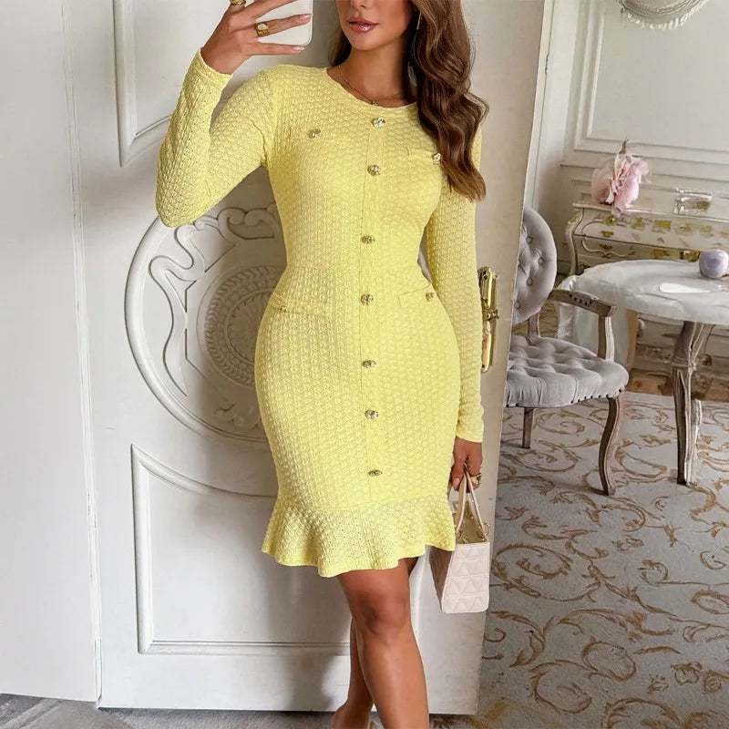 New Spring and Autumn Elegant Crew Neck Solid Color Long Sleeve Knitted Party Dinner Casual Bodycon Dress for Adult Women