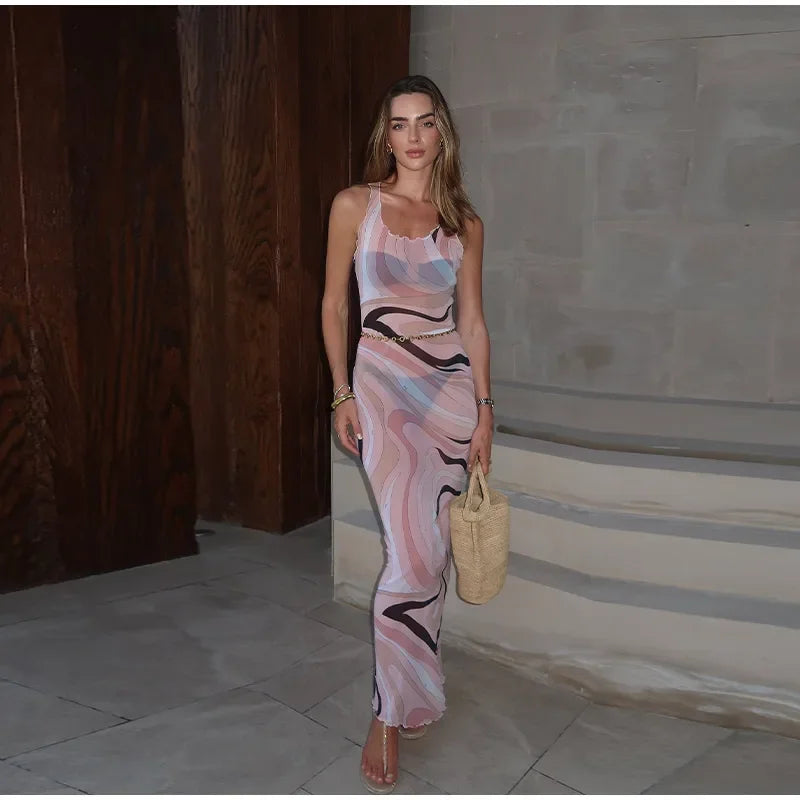Sexy Perspective Printed Long Dresses Women Retro O-neck Full Sleeve Holiday Dress Female New Summer Fashion Street Party Beach