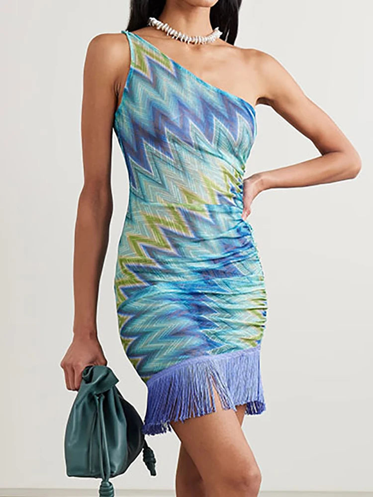 Summer Women Skew Collar Print Mini Dress, Holiday Sleeveless Patchwork Chic Party Dress, New Tassel Fashion Simple Ladies Dress