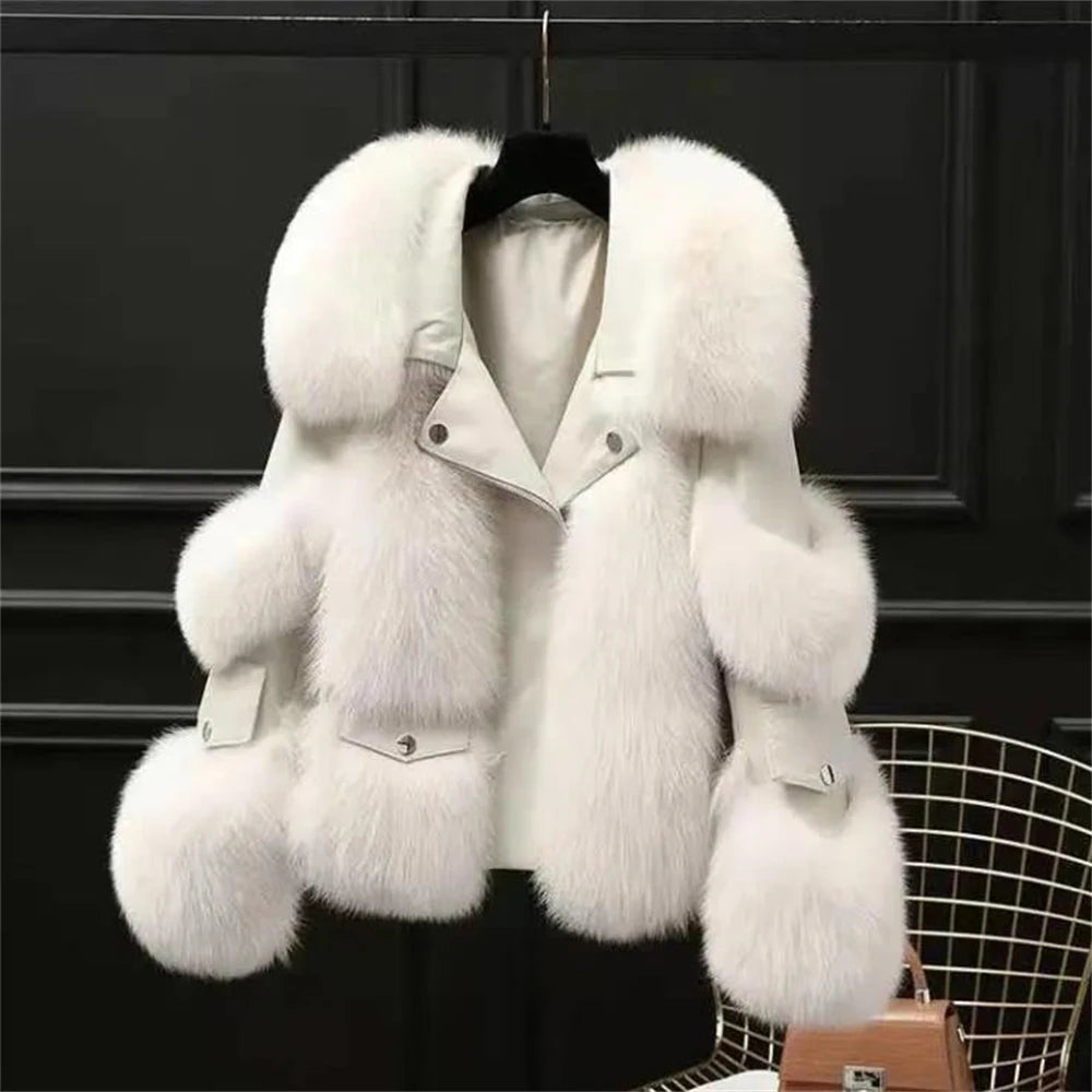 Winter New Outerwear Tops Warm Short Imitation Fox Fur Coat Imitation Leather Full Fox Fur Motorcycle Jacket Luxury