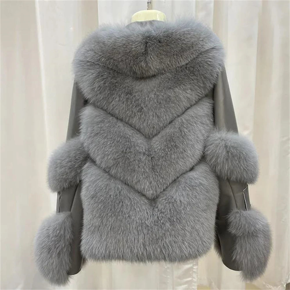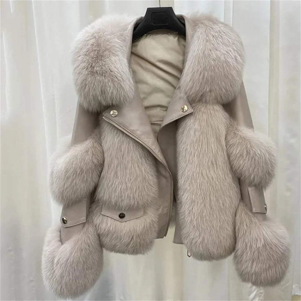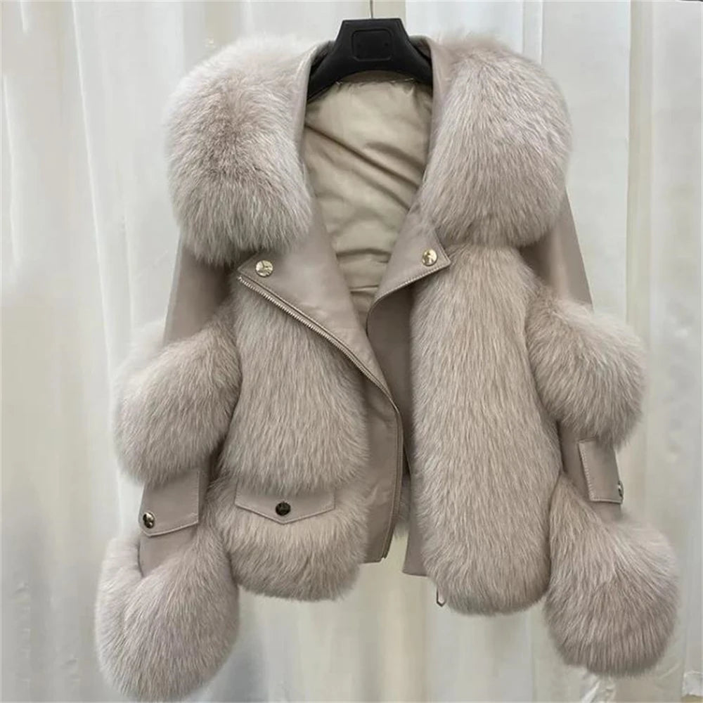 Short Imitation Fox Fur Coat Imitation Leather Full Fox Fur Motorcycle Jacket Luxury