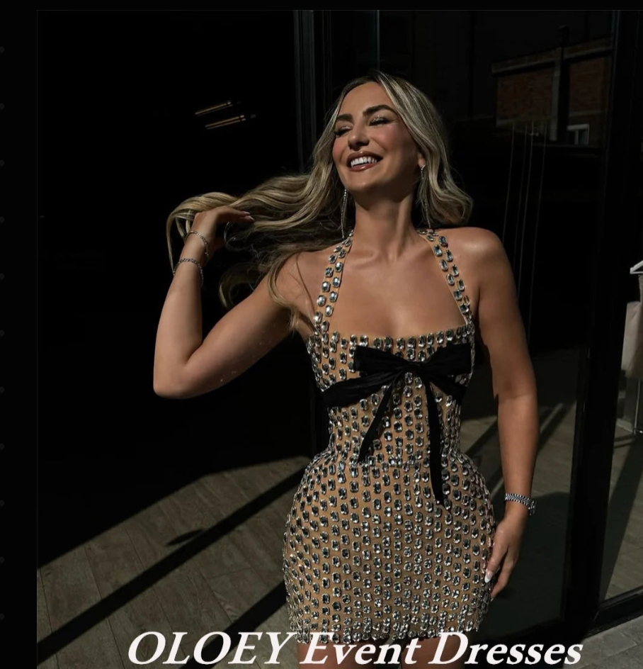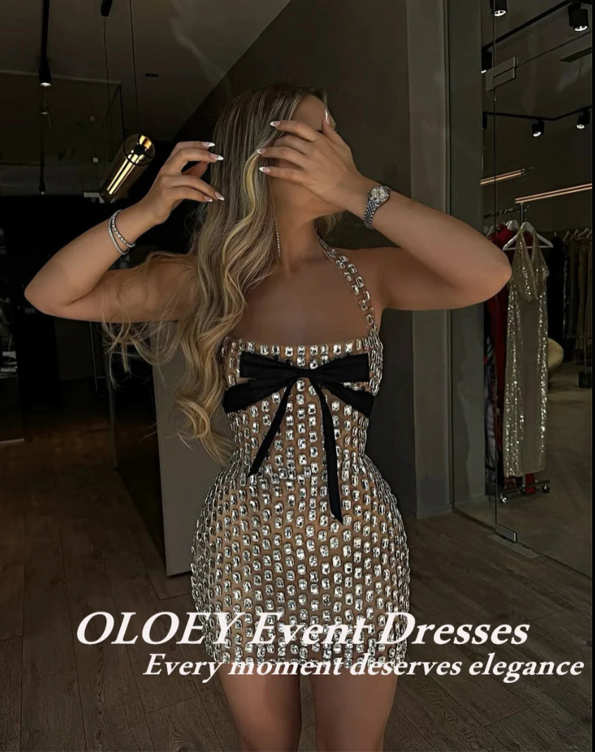 ZD-Luxury Crystal Bowknot Mini Bodycon Dress for Women, Halter Neck, Backless, Rhinestone, Beaded, Short Party Dress, Shiny