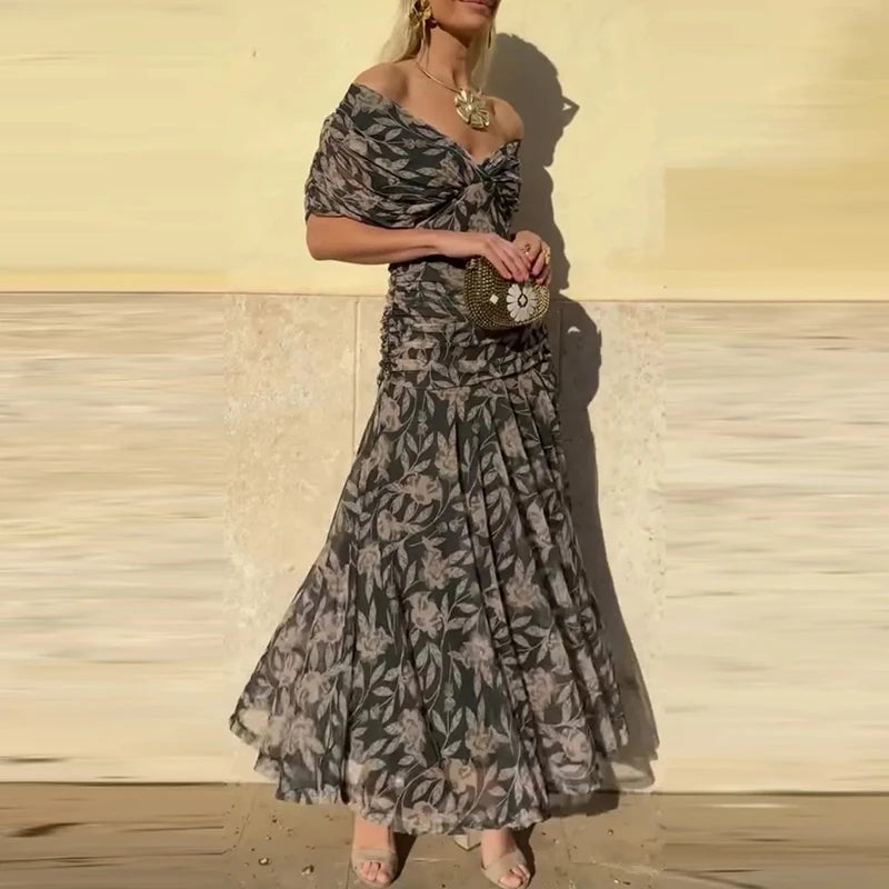 2025 Floral Print High Waist Pleat Party Dress Elegant Women Bat Sleeve Swing Party Dress Female Chest Low Cocktail A-Line Dress