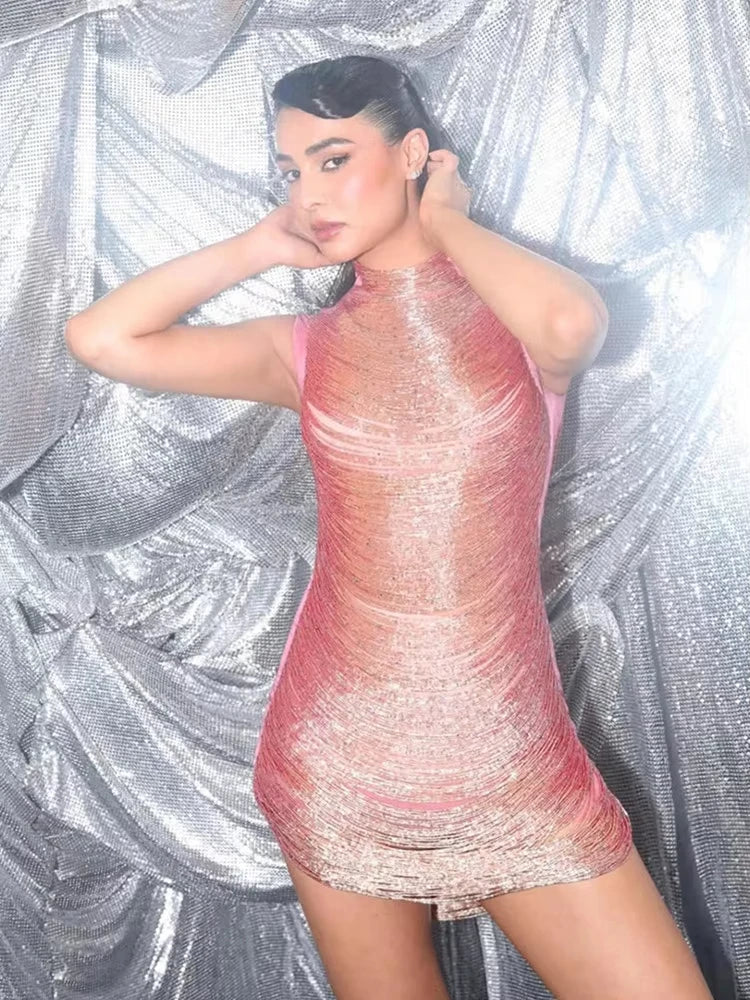 2025 Women Sexy O Neck Sleeveless Pink Tassel Mini Bodycon Bandage Dress Elegant Evening Club Party Dress