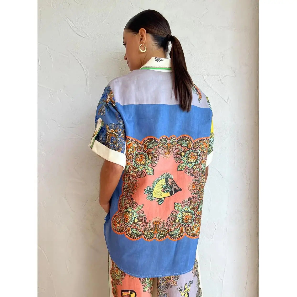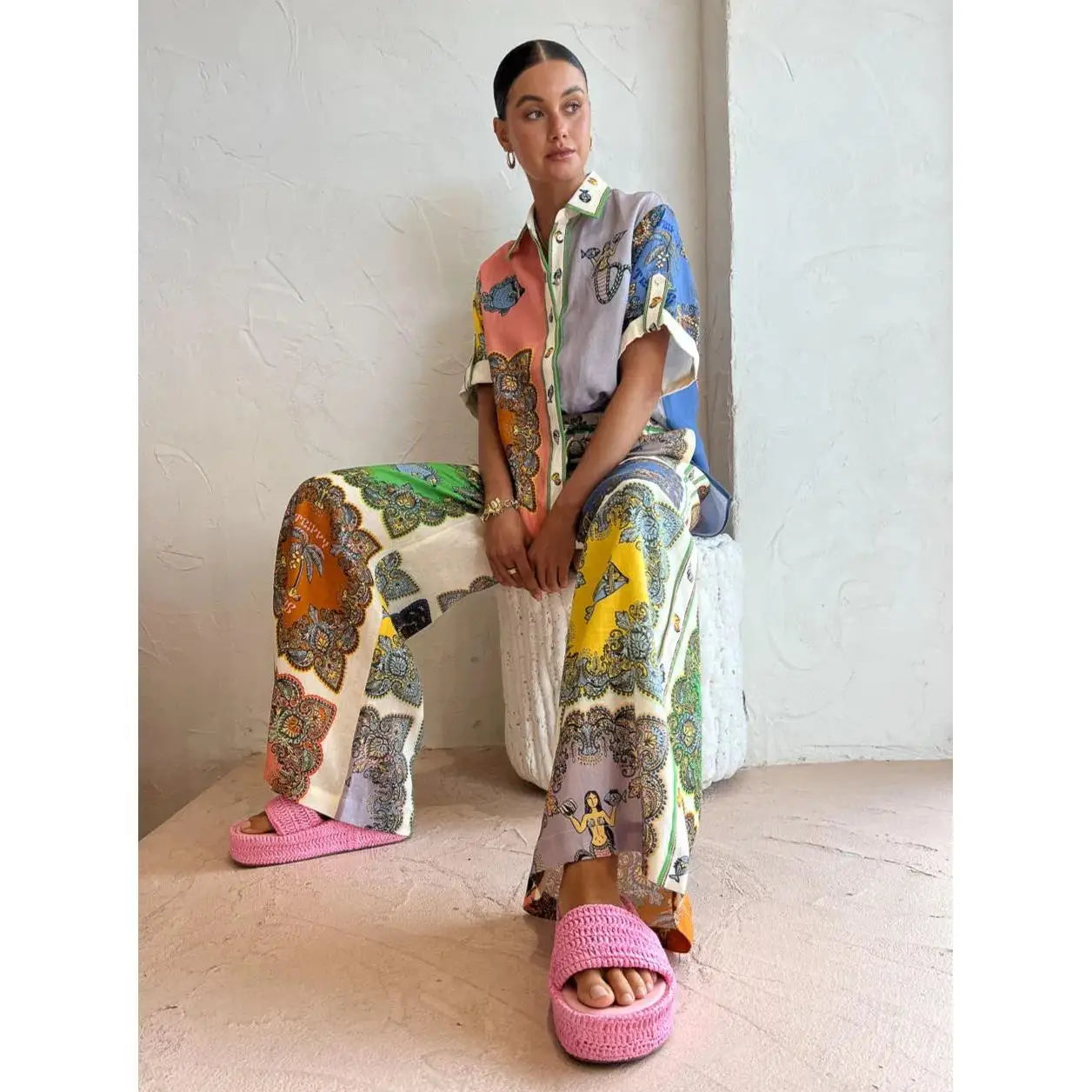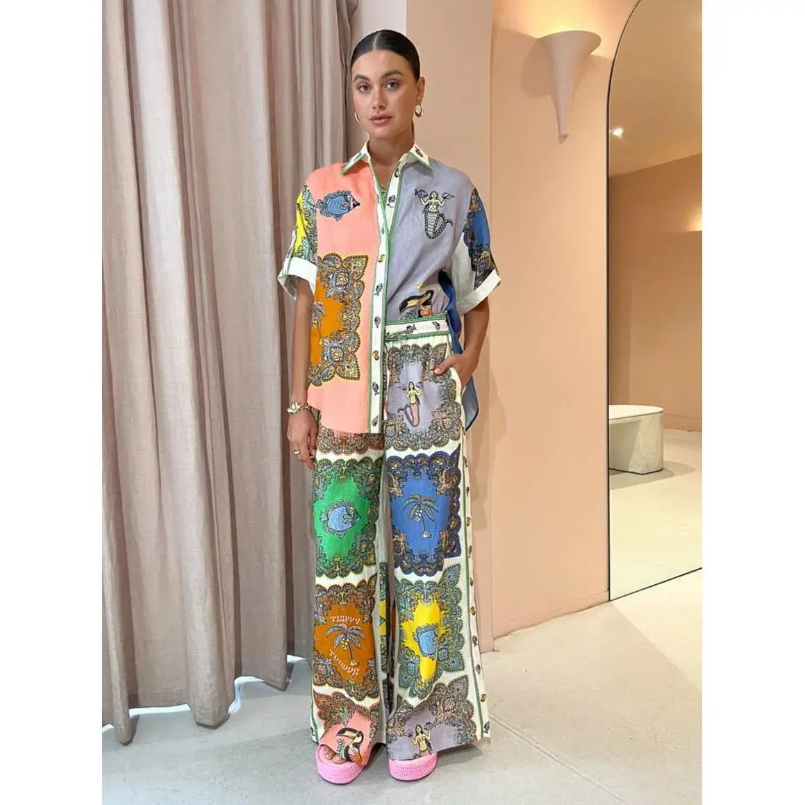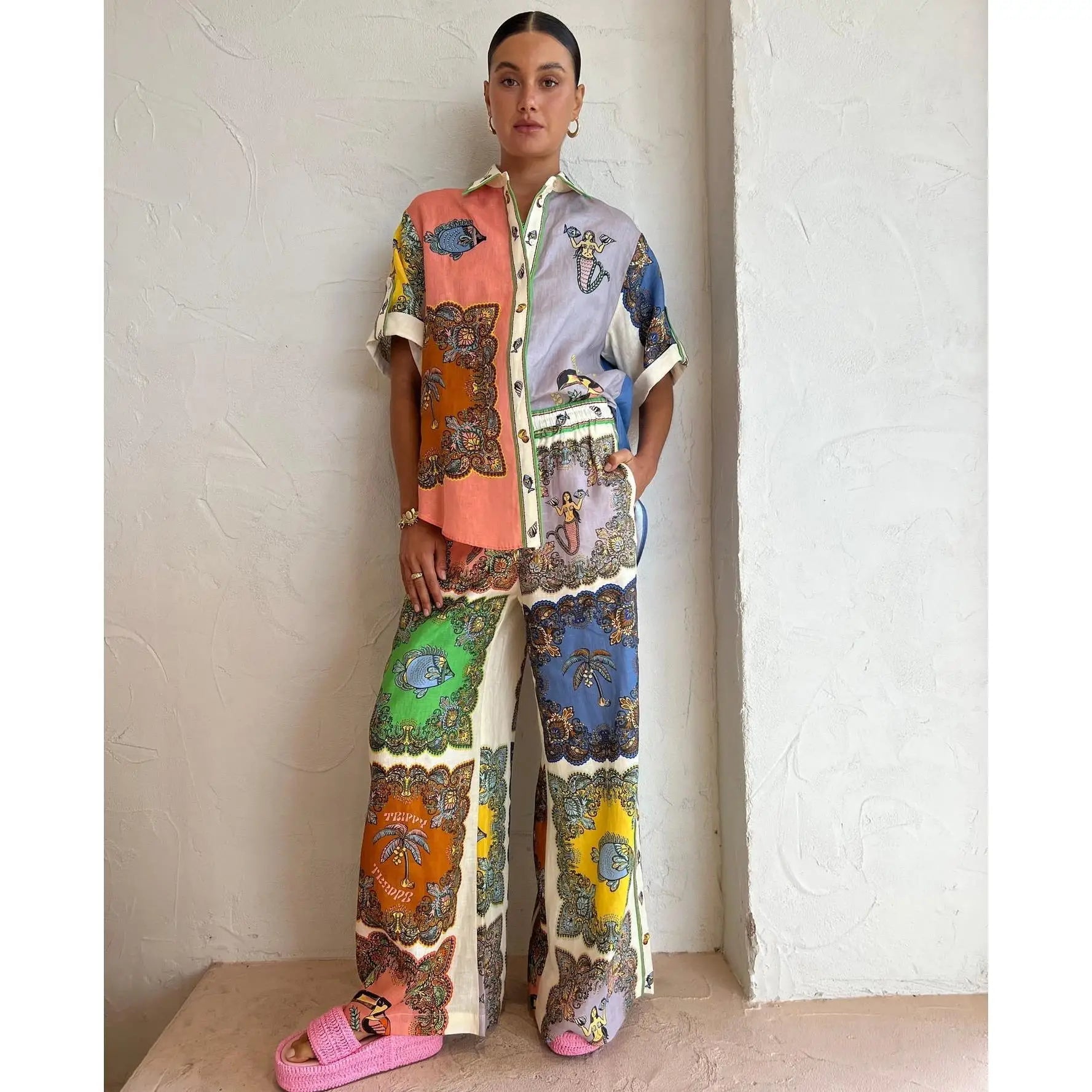 Cotton Linen shirt PAnt Tee Piece Set Women's Casual Faion Summer Outfit Long Pants Tee Quarter Sve Top