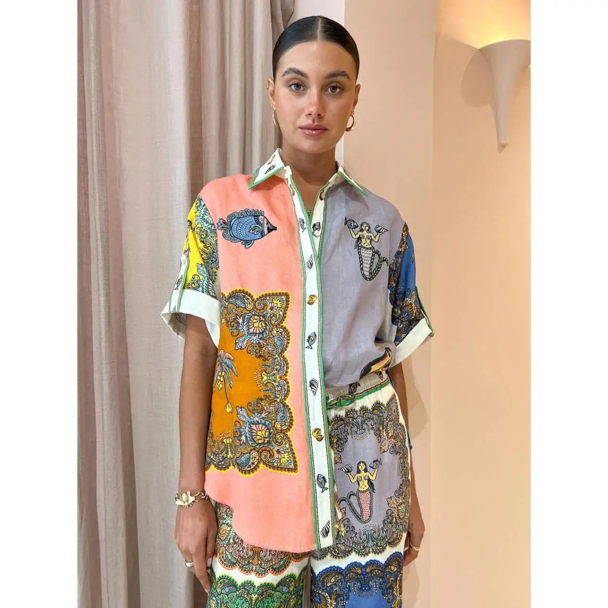 Diamonds Beaded Stitch Mid-length Denim Shirts