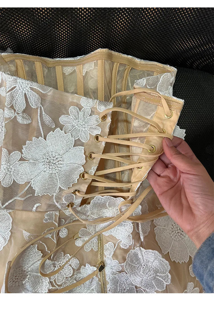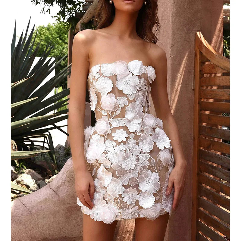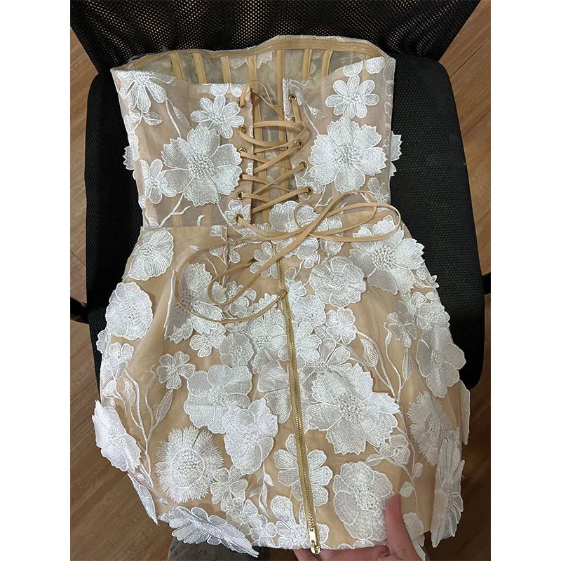French Elegant Embroidered Flower Strapless Short Dress Women's Sleeveless Waist-Cinching Fluffy Skirt Party Dress Fairy Skirt