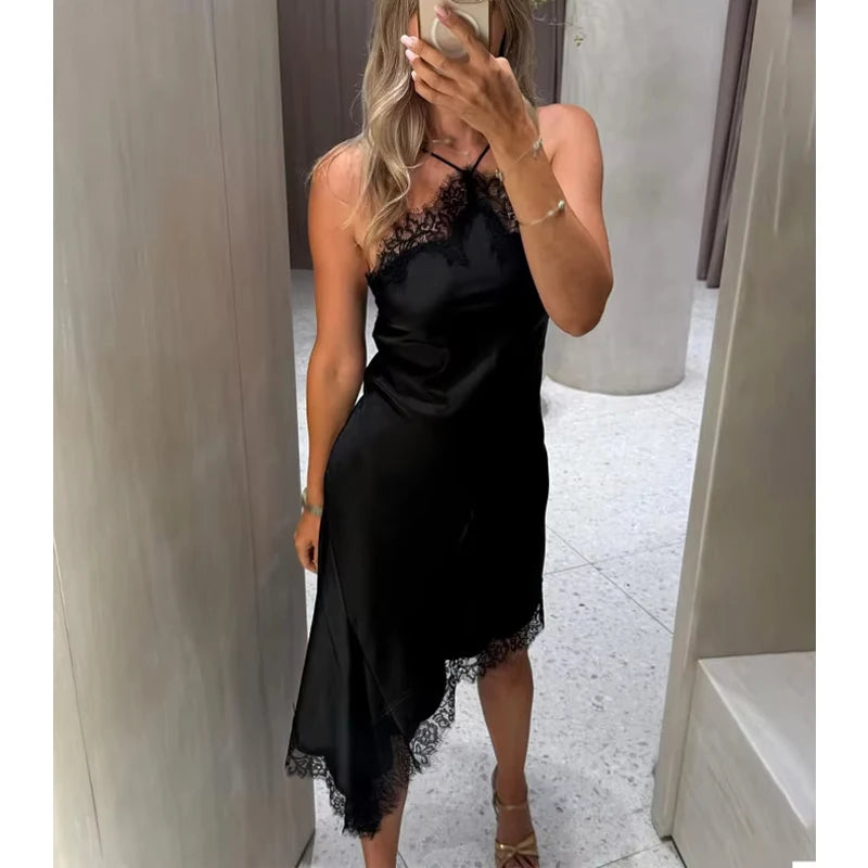 Woman Satin Backless Long Dresses for Women off Shoulder Midi Dress Asymmetric Slip Women's Dress