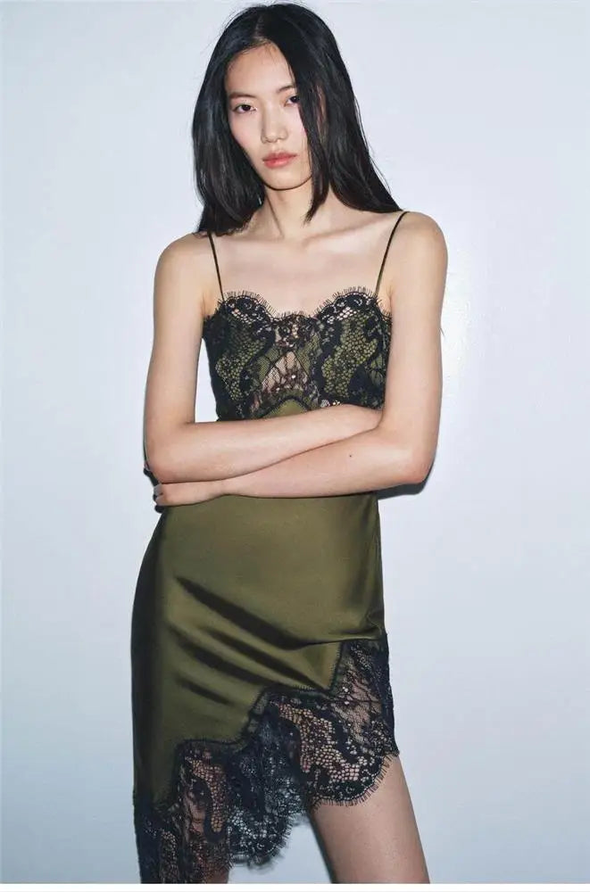 Green top and bottom with black lace diagonal hem