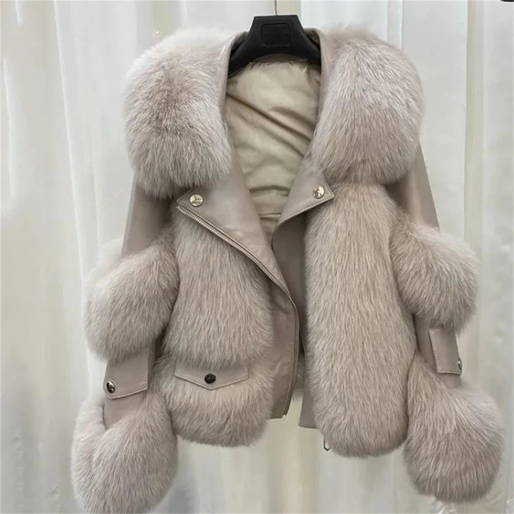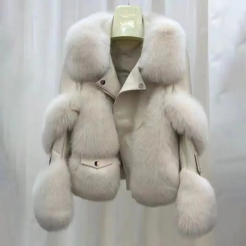 Short Imitation Fox Fur Coat Imitation Leather Full Fox Fur Motorcycle Jacket Luxury