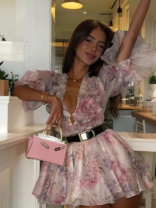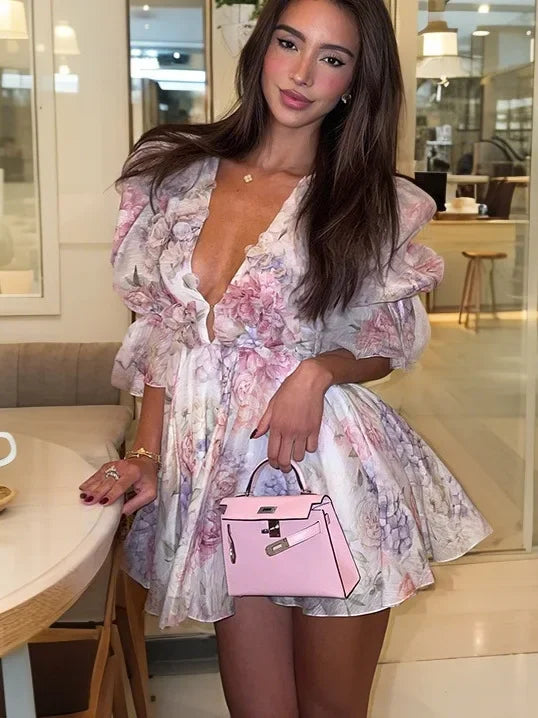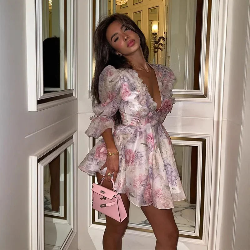 Print Dress Hepburn Style High Waist Short Skirt Bubble Sleeve Elegant Design Ankle-Length Women's Dress