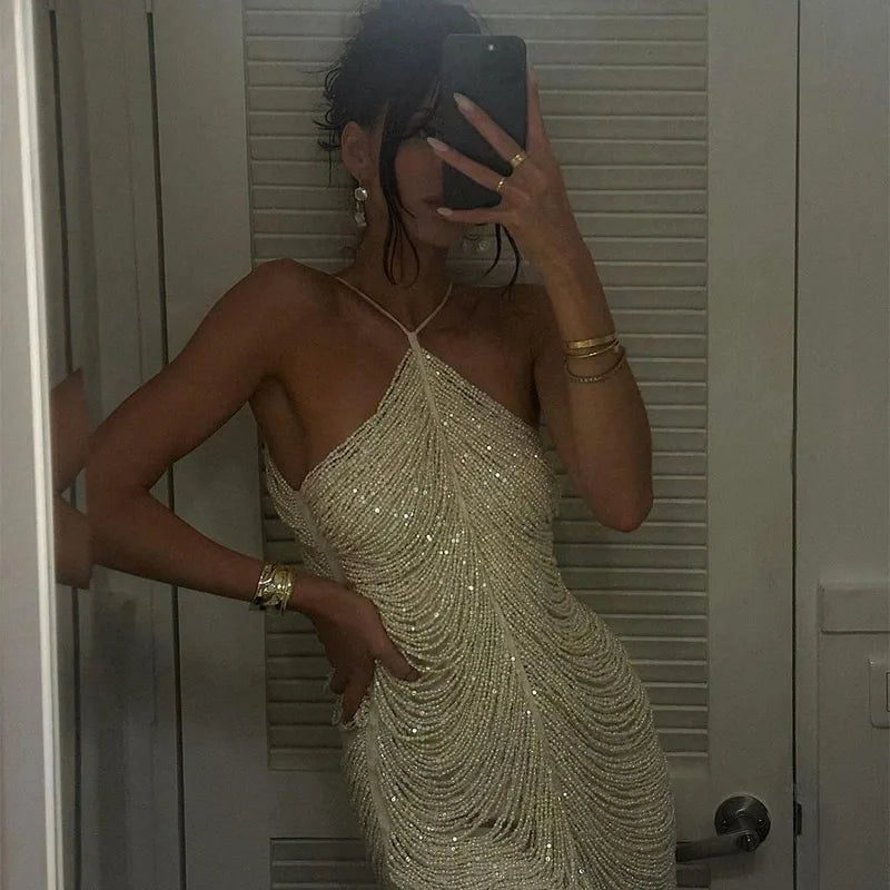 Halter Bead Fringe Dress Hanging Neck Fashion Sexy Backless Ladies Short Dress Slimming Shiny Socialite Women Party Evening GownSeason: Summer