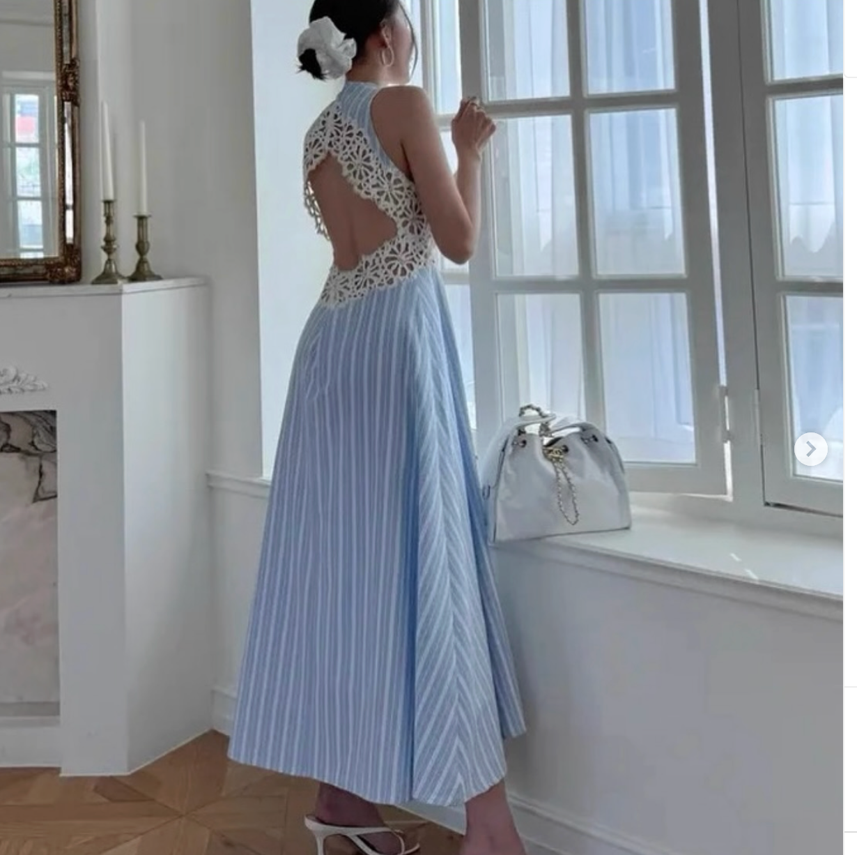 Lace Hollow Splices Shirt 2025 Summer Women's Long Sleeve Sleeve Blue and White Striped Shirt British Style