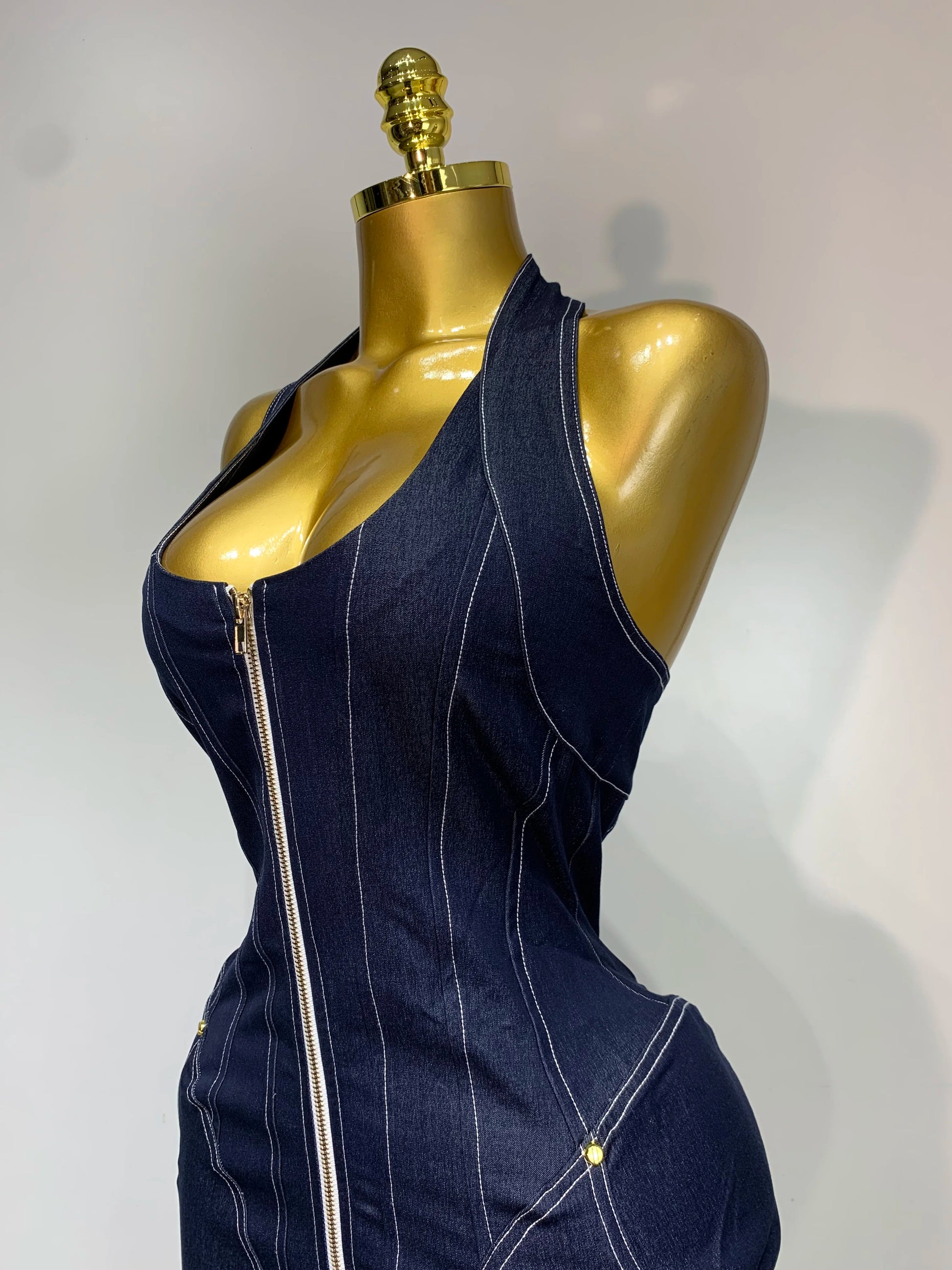 Women Denim Bodycon Dress 2025 Fashion Sleeveless Halter Zipper Bright Line Decoration Blue Jean Dresses Evenign Party Dress
